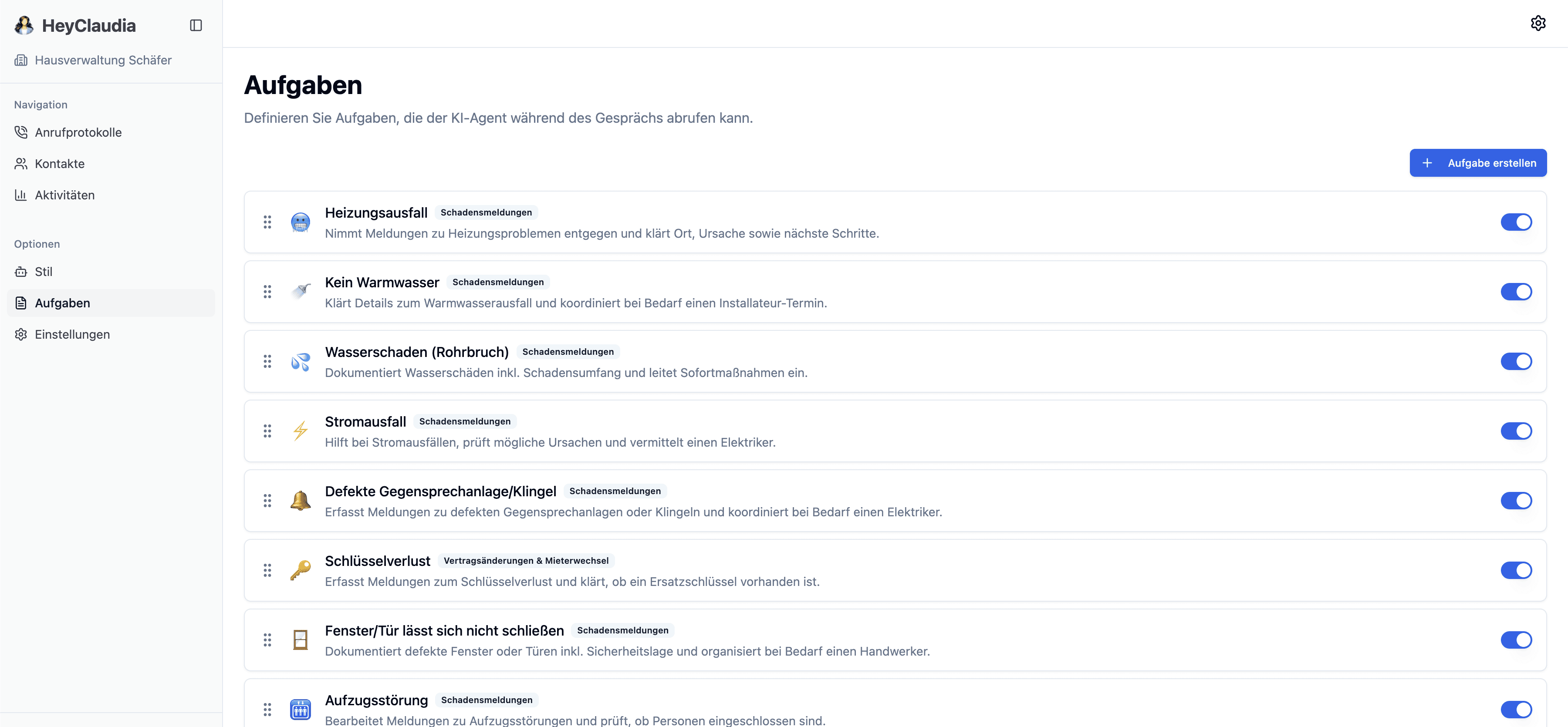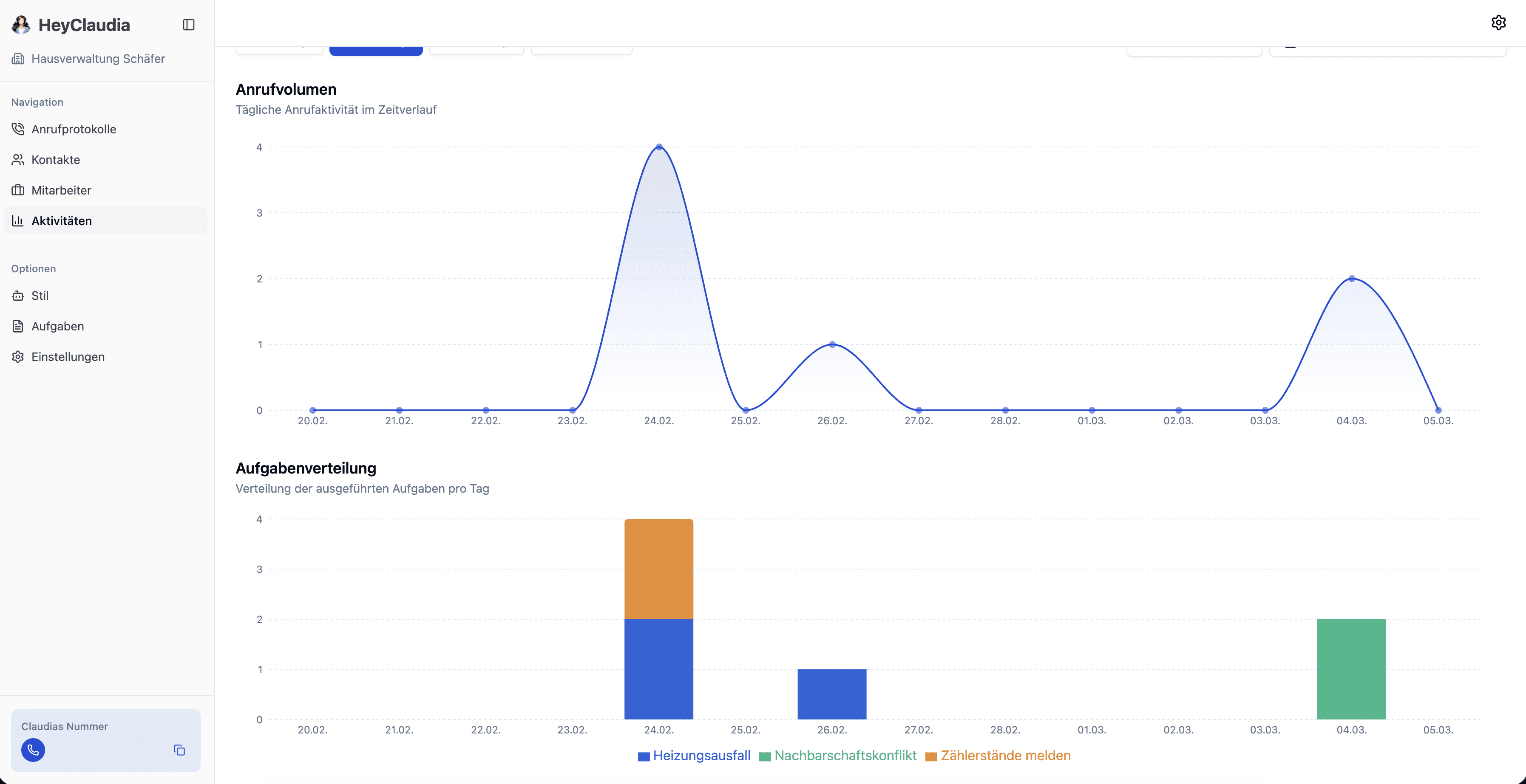 Wir lassen dich nach der Einrichtung nicht allein. Bei Fragen oder Problemen erreichst du unser Support-Team jederzeit per E-Mail an info@heyclaudia.ai Wir haben Claudia gezielt für die Anforderungen von Hausverwaltungen entwickelt: leistungsstark, zuverlässig und gleichzeitig wirtschaftlich sinnvoll. Unser Anspruch ist es, echten Mehrwert zu schaffen – ohne komplexe Systeme, lange Implementierungsphasen oder hohe laufende Kosten. Da Claudia vollständig cloudbasiert arbeitet und ohne zusätzliche Hardware oder aufwendige IT-Projekte auskommt, können wir eine professionelle Lösung zu fairen Konditionen anbieten. Sie zahlen ausschließlich für die tatsächlich genutzte Leistung und profitieren gleichzeitig von einer skalierbaren, hochwertigen Technologie. So erhalten Hausverwaltungen eine effiziente Lösung, die Prozesse spürbar entlastet – transparent, planbar und ohne unnötige Kostenstrukturen.